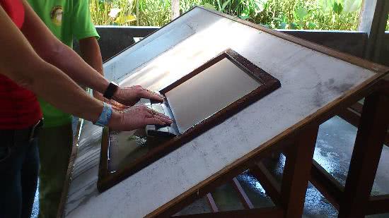 Работники сначала вымывают навоз, варят, затем добавляют перекись водорода, силикат соды, мыльный раствор и измельчают на специальном станке. Полученную массу вымешивают до состояния плотного теста, делят на порции, растворяют в воде, и заливают в формы. Все это высушивается на солнце и, в результате, получается плотная бумага.