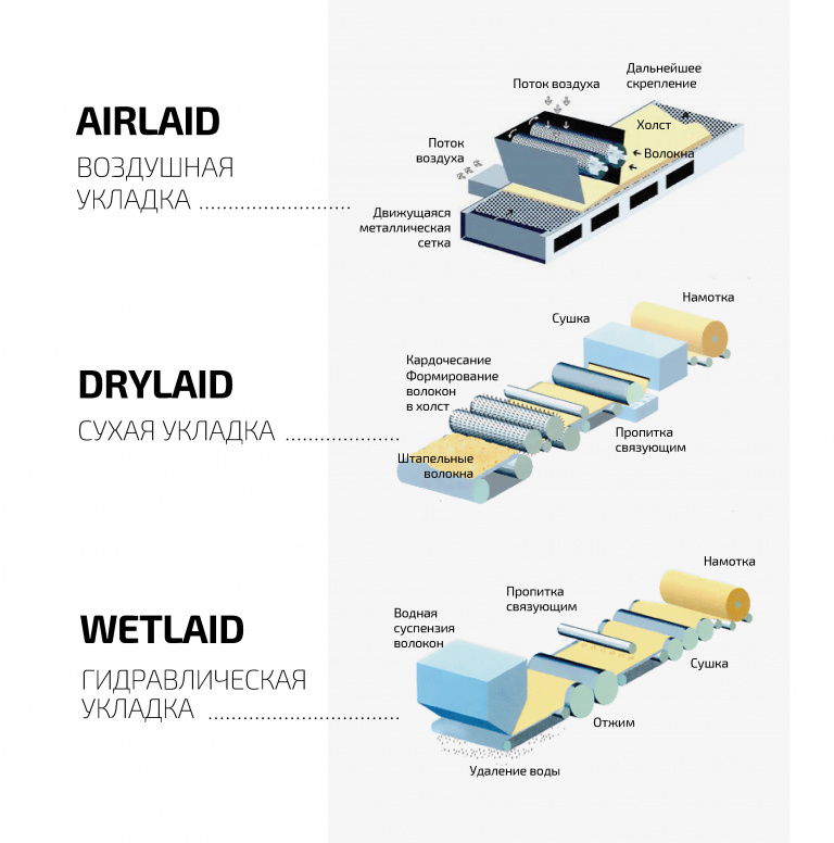Есть и несколько других способов получения нетканых материалов из тех же сырьевых компонентов. Например, airlaid похож на спанлейс, но роль водяных струй в нем выполняют потоки воздуха. Используют и так называемое кардочесание, или drylaid, при котором волокна после чесальной машины укладываются в форму. Гидравлический способ позаимствован из бумажной индустрии – волокна перемешиваются в воде, после чего эта «каша» просушивается в форме.