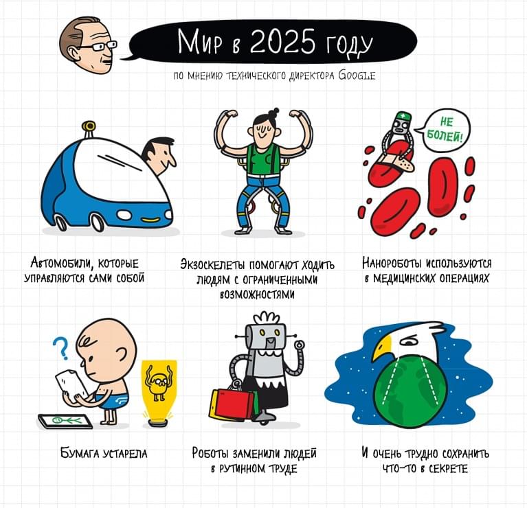 И у нас есть основания ему верить! Потому что Курцвейл – один из самых дальновидных футурологов, и многие его прогнозы уже сбылись. Пожалуй, самый значительный и «общедоступный» из них – предсказание эры Интернета, сделанное в 1980-х годах. Тогда Сетью пользовались только военные, ученые и мегакорпорации, а Курцвейл заявлял, что совсем скоро Интернет будет доступен почти каждому, а потом вообще станет беспроводным. К 2030 году Курцвейл ждет создания виртуального пространства, куда люди смогут перенести реальную жизнь. Он безгранично верит в науку и считает, что наше время – самое интересное за всю историю.