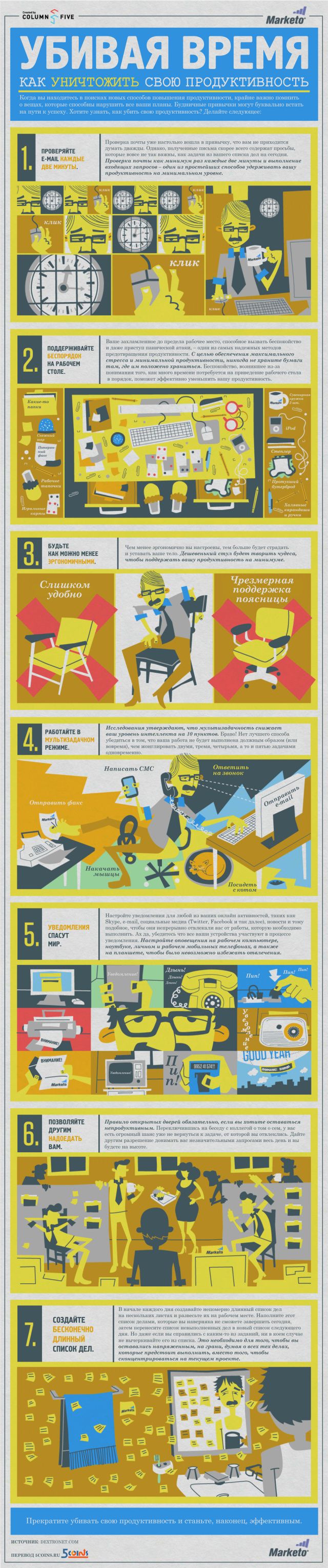 Иногда... Да нет, даже не иногда некоторые люди сталкиваются с такой проблемой - убегающим временем и непродуктивно прошедшим днем. И вроде бы работал не покладая рук, но результаты не видны невооруженным глазом... На marketo.com выложили забавную инфографику, говорящую нам о том, как продолжать в том же духе))). В инфографике представлены главные причины, по которым работа наша становится неэффективна. За счет этого  красочного представления можно сделать определенные  выводы и перестать "убивать свою продуктивность" .