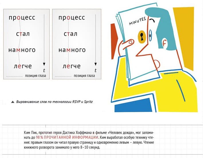 Spritz основана на методе быстрого последовательного визуального предъявления (rapid serial visual presentation – RSVP). Этот метод был придуман в 1970-е годы для проведения психологического эксперимента по изучению памяти. Испытуемые смотрели на экран с быстро сменяющимися картинками, пытались их запомнить и найти нужное изображение. Многие могут представить, как проходят подобные эксперименты, вспомнив, как в фильме «Пятый элемент» Лилу изучила историю человечества буквально за минуту, просматривая картинки на экране компьютера.