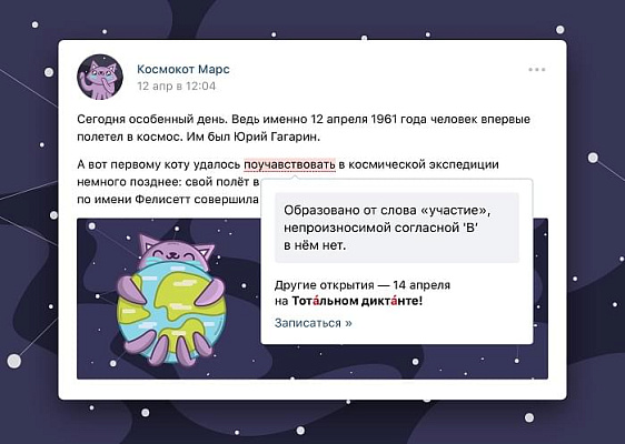 Социальная сеть «ВКонтакте» запускает онлайн-акцию в целях повышения грамотности пользователей, приуроченную ко всероссийскому «Тотальному диктанту». 13 и 14 апреля при написании публичных постов и комментариев «ВКонтакте», соцсеть будет отмечать в них орфографические и пунктуационные ошибки и подсказывать правильные варианты. Перед публикацией можно исправить свою ошибку.