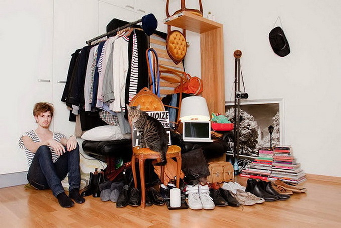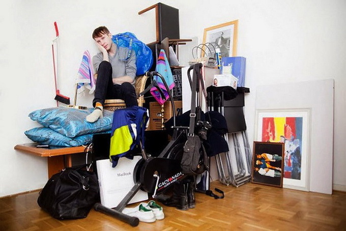 Ну все понятно, у кого тренажер, у кого комп, у кого гитара, у кого кошка... и у все есть хоть какие-никакие предметы одежды. А у последнего товарища что??? Все, что на нем плюс запасные джинсы в уголке? даже обуви нет ) Книжный червь собственной персоной? )