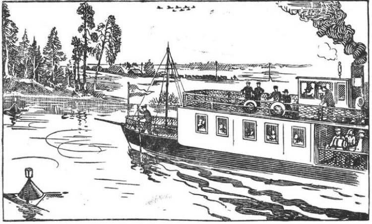 Хм... 2) время года - осень, птички улетают, 1) отсюда следует, раз они летят на Юг, то пароход на север. Для рек, текущих с севера на юг (на это указывают бакены), крутой правый берег, стало быть, пароход идет против течения. 3) Река неглубока, видно матроса с мерной рейкой. 4) Пристань близко, пассажиры уже с вещами на выходе. 5) Пристань на правом берегу (относительно течения). 6) Предполагаю, что это время к обеду (видны жрущие пассажиры в столовой/ресторане). Или я все перепутал?