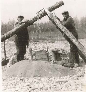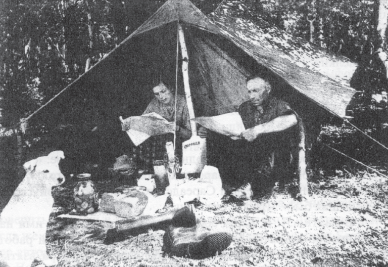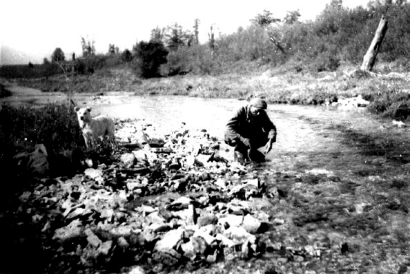 Ф. А. Беликов под приглядом Пушка отмывает очередной шлих на валунно-галечной косе на р. Шестопаловке почти против устья ручья Загадочного. Фото: «Открытие века: алмазоносная кимберлитовая трубка Зарница. Отчет Н. Н. Сарсадских и Л. А. Попугаевой о результатах работ, проведенных тематической партией № 26 Центральной экспедиции и партией № 182 Амакинской экспедиции в среднем течении р. Даалдын в 1954 г.», geokniga.org