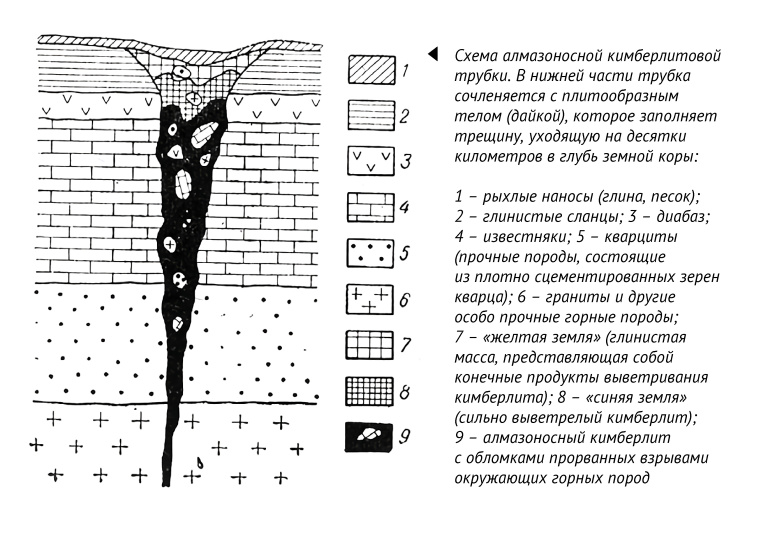 Лишь немногие знали о сходстве геологических особенностей Сибирской платформы с геологией Южной Африки, ее богатейшими месторождениями коренных алмазов в кимберлитовых трубках. Термин не совсем удачный: в действительности трубки – это цилиндрические тела, имеющие некоторую конусность. Они достигают глубины 1,5–2 км, и от них тонкая «ножка» ведет в глубь земли. Она наследует канал, по которому с глубины в 150–200 км поступила из земной мантии горячая магма, застывшая в пределах осадочных пластов. Трубки сложены уникальной горной породой – кимберлитом, названным так по городу Кимберли в юго-восточной Африке, где его впервые нашли в XIX веке. Внешне кимберлит напоминает бетон.