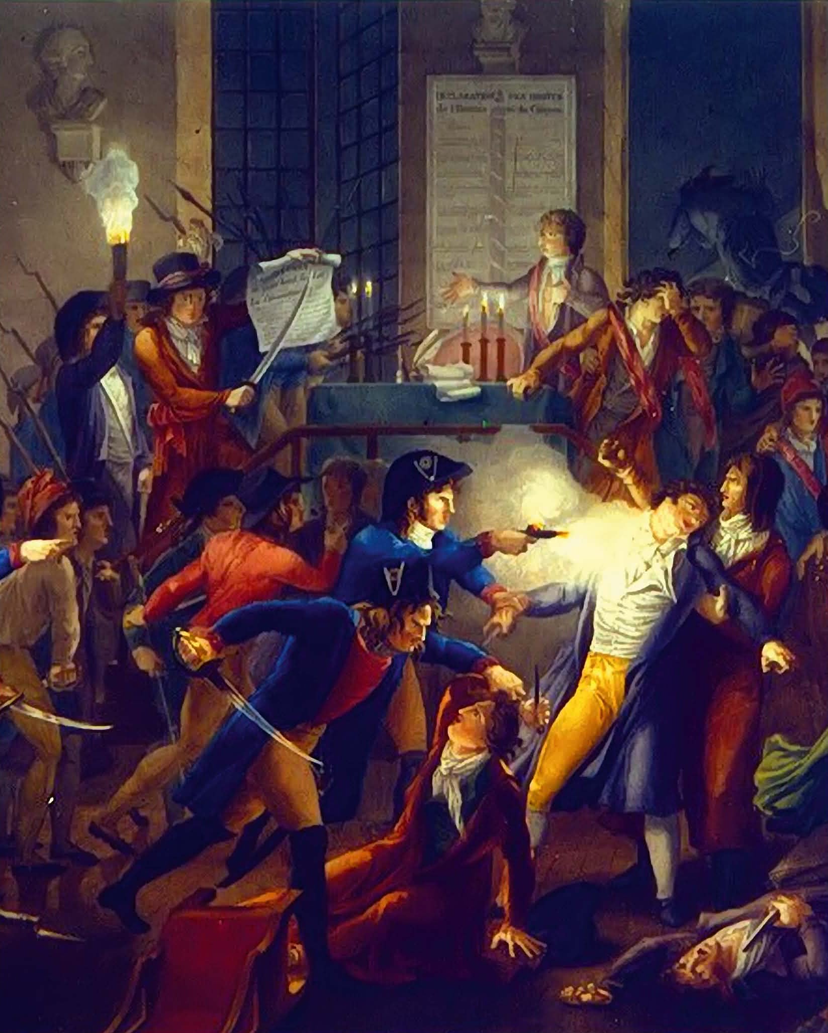 Жандарм Мерда стреляет в Робеспьера при аресте (цветная гравюра)