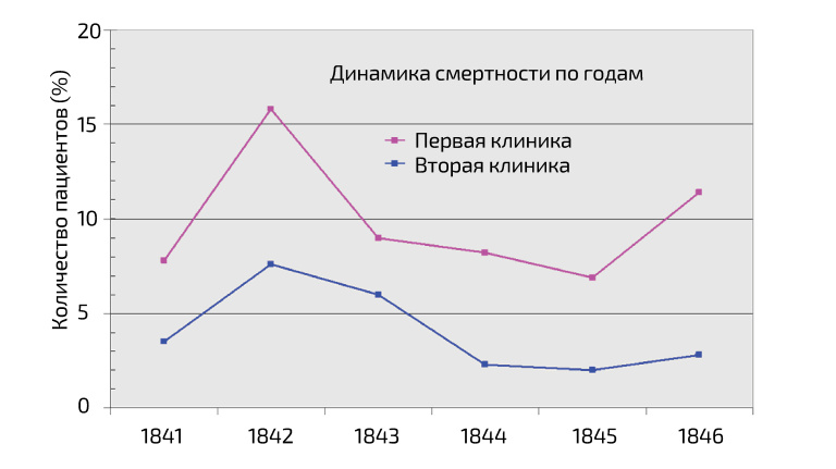 В своей книге 1861 г. Земмельвайс представил доказательства того, что патологическая анатомия появилась в Вене одновременно с увеличением смертности от послеродовой лихорадки. Вторая вертикальная линия обозначает введение обязательного мытья рук хлорной известью (1847 г.). Для сравнения показана статистика дублинского роддома, в котором не практиковалась патологическая анатомия. commons.wikimedia.org
