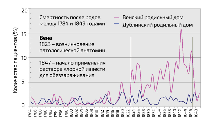 В своей книге 1861 г. Земмельвайс представил доказательства того, что патологическая анатомия появилась в Вене одновременно с увеличением смертности от послеродовой лихорадки. Вторая вертикальная линия обозначает введение обязательного мытья рук хлорной известью (1847 г.). Для сравнения показана статистика дублинского роддома, в котором не практиковалась патологическая анатомия. commons.wikimedia.org
