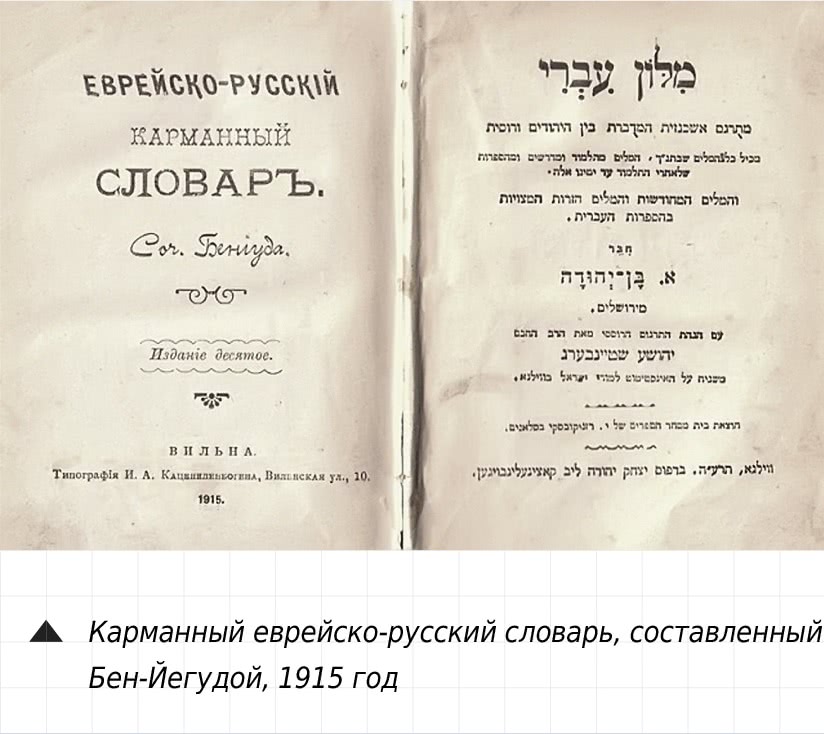 Первый том словаря был опубликован в 1910 году, а последний, восемнадцатый, только через 37 лет после смерти Бен-Йегуды. Работа над «Полным словарем языка иврит», объемом в восемь тысяч страниц (!), продолжалась полвека, с 1906 по 1958 год. Но сей поражающий воображение труд был не единственным достижением в жизни этого удивительного человека: он с 1908 года выпускал первую полноценную газету на иврите «Ха-Цви», стал основателем политического движения гебраистов, выступавших за возрождение иврита как единственного языка, на котором может строиться еврейская национальная культура.