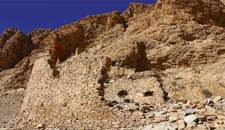 В этот раз хозяин гестхауса, в котором мы остановились, поехал с нами и не только показал маршрут коры вокруг Ракшас Тала, но и провел нас к развалинам буддийского монастыря Тсепгье, расположенного в глубокой долине на расстоянии 3 км в северо-западном направлении от озера. Этот уникальный комплекс, состоящий из монастыря и почти тридцати пещер для ретритов (медитаций), был разрушен китайцами во время «культурной революции» и не восстановлен до настоящего времени.