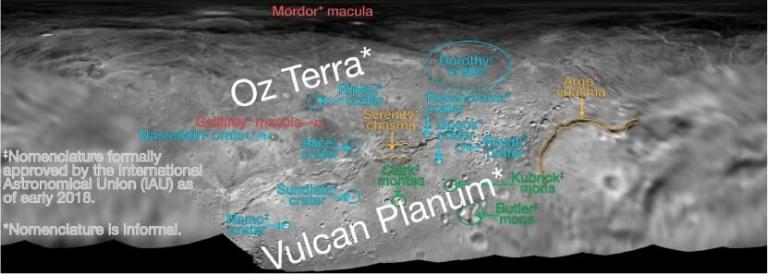 Формальная и неформальная номенклатура для регионов и особенностей Харона, используемая в новой карте. Оз Терра включает средние и высокие широты. Вулкан включает в себя экваториальные и приэкваториальные области. Если это так, то, возможно, в прошлом Харона его внутренняя часть нагревалась и претерпела химические или физические изменения, которые привели к его небольшому расширению. Роббинс объяснил, что это расширение потрескало поверхность – аналогично тому, как поверхность пирога трескается, когда пирог поднимается во время выпечки. Затем теплые материалы снизу вытекли над поверхность Харона. Этот материал могу покрыть собой много оригинальной поверхности Харона, наряду с кратерами.