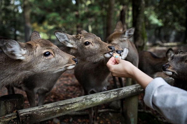 Красивый национальный парк находится возле старой столицы Японии. В нем живут более тысячи оленей, которые иногда выходят на городские улицы в поисках крекеров, которыми их кормят приезжие. Туристам запрещено кормить животных другой едой.