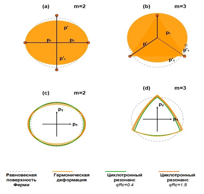 Рисунок 1. Механизм долгой жизни нечетных возмущений в электронной жидкости. (a, b) Схематическое изображение столкновений электронов для четной (m=2) и нечетной (m=3) деформации поверхности Ферми. (c, d) Сравнение формы теоретических гармонических возмущений и деформаций поверхности Ферми, возникающих при высокопорядковом циклотронном резонансе. Источник: Physical Review Letters 134, 226902 (2025).