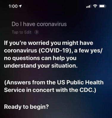 Распознать возможное заболевание пользователь сможет после прохождения небольшого теста. Сначала ассистент уточняет, есть ли у пользователя повод для беспокойства, а затем перечисляет основные симптомы: лихорадка, одышка и сухой кашель. Если человек подтверждает их наличие и интенсивность, то Siri посоветует обратиться к врачу. В случае, если симптоматика не ясна, она задаст ещё несколько наводящих вопросов. Головокружение и боли в груди могут её убедить на сто процентов, после чего она предложит установить рекомендуемые медицинские приложения или помочь связаться с лечащим врачом.