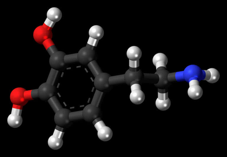 Шарообразная модель молекулы дофамина – нейромедиатора, который влияет на центры вознаграждения и удовольствия мозга. Jynto/Wikipedia.В ходе