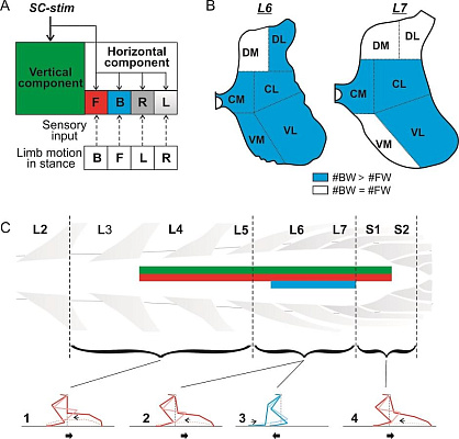 Группа исследователей, куда вошли специалисты из лаборатории нейропротезов института трансляционной биомедицины СПбГУ, смогла выяснить, что у некоторых млекопитающих спинальные нейронные сети, активация которых заставляет животное идти назад, находятся в достаточно узкой зоне поясничного отдела — в сегменте L6 и соседствующих с ним ростральной части сегмента L7 и каудальной части сегмента L5. При этом спинальные нейронные сети, стимуляция которых запускает движение вперед, занимают почти весь пояснично-крестцовый отдел спинного мозга (от сегмента L3 до сегмента S2).