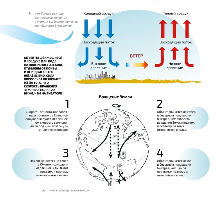 Второй важный фактор, кроме солнечного тепла, – постоянное вращение планеты вокруг своей оси. Подчиняясь силе Кориолиса, все потоки воздуха, движущиеся вдоль Земли, отклоняются. Поэтому ветры в Северном полушарии «кренят» вправо, а в Южном – влево (по отношению к направлению движения). Обычно ветры движутся над поверхностью горизонтально, но существуют и восходящие и нисходящие потоки: циклоны и антициклоны (подробнее в нашем материале о творцах погоды). И если на Земле ветер представляет собой потоки воздуха (в основном смесь азота и кислорода), то на других планетах – смесь свойственных им газов (подробнее о космическом ветре).