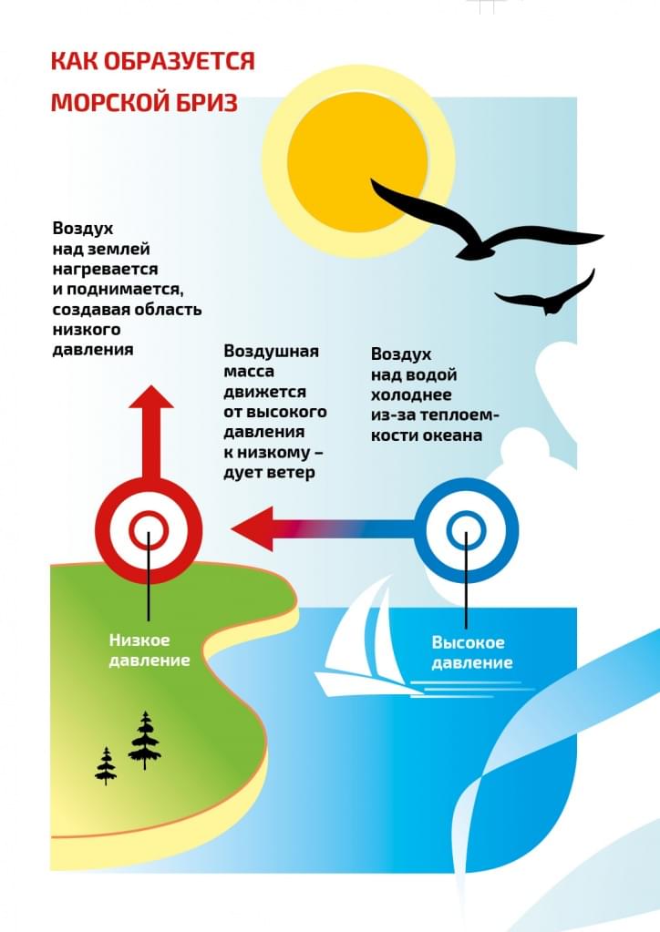 В умеренных широтах дуют западные ветры – они влияют на формирование океанических течений, переносящих теплые экваториальные воды к западным берегам континентов. А на полюсах преобладают восточные ветры – сухие, нерегулярные и слабые, они дуют из полярных районов в низкие широты. Поскольку в полярных областях солнечного тепла меньше, воздух там быстро охлаждается и опускается, образуя высокое давление и выталкивая приполярный воздух в направлении более низких широт. Но Земля – это не только материки и океаны, а еще множество локальных географических объектов: водоемы, моря, пустыни, горные массивы. Разнообразие подстилающей поверхности создает местные ветры. Например, на берегах морей и больших озер дуют морской и континентальный бриз, сменяющие друг друга утром и вечером. Особенно они заметны летом, когда разница между температурами воды и земли самая высокая. Морской (дневной) дует с моря на прибрежье, а ночной (континентальный, береговой) – с суши на море. Оба достигают небольшой скорости в 1–5 м/с.