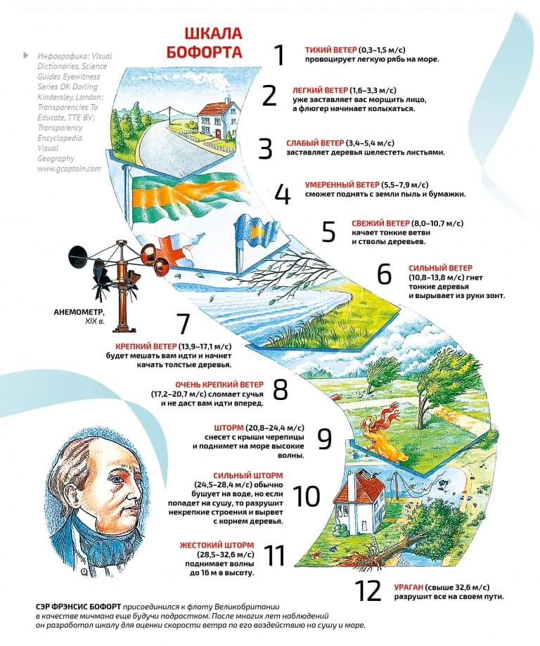 Основными характеристиками ветра считают скорость, силу и направление. Анемометр – механический прибор, в котором движение воздуха приводит в действие лопасти и на шкале отображается скорость ветра. От нее неотделима его сила, которую изучают с помощью шкалы Бофорта – она показывает, сколько метров преодолевает слой воздуха в секунду. Наиболее распространена 12-балльная шкала, но возможно использование 17-балльной, если речь идет о сильном урагане. Чем выше балл, тем сильнее и опаснее последствия от ветра: движение океанических и морских волн, распространение дыма из трубы, качание деревьев, помеха движению человека и др.