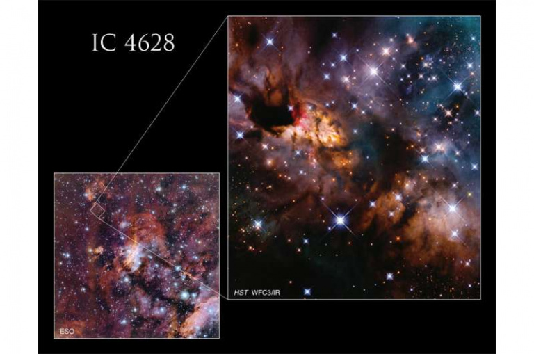 Новый снимок «Хаббла» демонстрирует небольшой участок туманности как в видимом, так и в невидимом инфракрасном диапазонах. Это позволяет в деталях рассмотреть структуру участка, в том числе и яркие зоны сияющего газа.