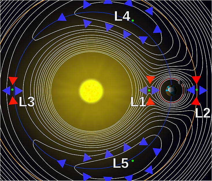 Точки Лагранжа – это позиции в пространстве, где силы гравитации (белые линии) системы двух тел (например, Солнце и Земля) производят области притяжения (красные стрелки) и отталкивания (синие стрелки). Благодаря этому одновременному воздействию малое тело может оставаться в этих местах практически неподвижным. Мы могли бы создать там космические поселения! Иллюстрация: NASA /WMAP Science Team, nasa.gov