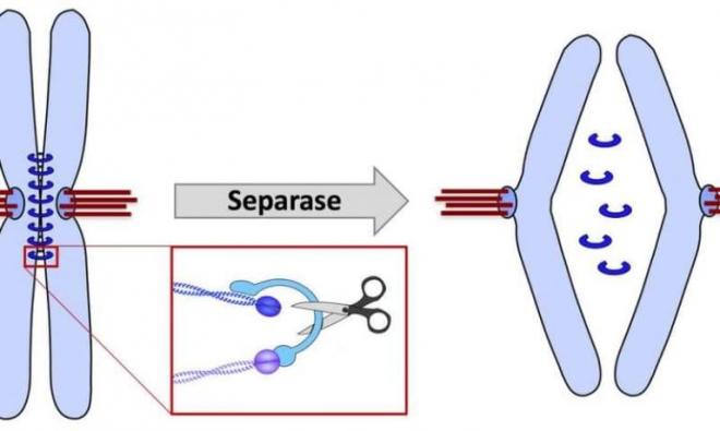 Деление клеток необходимо для роста и размножения человека. Прежде чем клетка начинает делиться, генетическая информация, хранящаяся в хромосомах, дублируется. Когда этот процесс завершен, каждая хромосома состоит из двух идентичных нитей ДНК, сестринских хроматид. Cohesin, кольцо, состоящее из нескольких белков, охватывает каждую хромосому и удерживает пару хроматид вместе. Уже во время подготовки к клеточному делению cohesin удаляется из плеч хромосом. Тем не менее, полное разделение сестринских хроматид может иметь место только тогда, когда cohesin, оставшийся в середине хромосом, разрезается ферментом отделением. Затем хроматиды мигрируют к двум противоположным концам аппарата веретена, где они формируют генетическую основу образующихся дочерних клеток.
