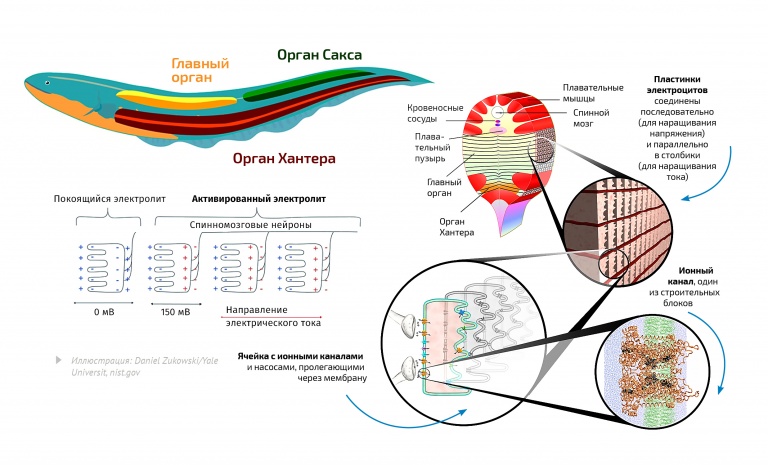 Электрические органы угря располагаются вдоль позвоночника и занимают ⅘ всей длины, или около 80 % тела. Это органы Хантера и Мена, которые создают высокое напряжение, и орган Сакса, вырабатывающий слабые электрические разряды во время перемещения и общения. Первые два находятся в верхней части тела угря, а орган Сакса – в хвосте. Если углубляться в процесс образования электроэнергии, то здесь последуют сложные формулировки об электроцитах, ионных каналах и ферменте Na-K-АТФаза. Но попробуем объяснить все проще. Электрические органы угря состоят из электрических пластинок – это видоизмененные нервные и мышечные клетки. Пластинки соединены последовательно и собраны в столбики, которые, в свою очередь, между собой соединены параллельно. Разность потенциалов, вырабатываемая пластинками, накапливается на противоположных концах электрического органа. Остается только активировать разряд. Чтобы это сделать, угрю нужно содрогнуться, и тогда между положительно заряженной передней частью тела и отрицательно заряженной задней образуется серия электрических разрядов.