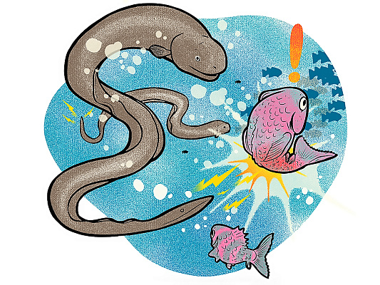 Когда угорь выдвигается на поиски добычи, он использует другие разряды – короткие последовательности из двух-трех импульсов. Они провоцируют у потенциальной жертвы мышечный спазм, и благодаря этому угорь понимает, где она спряталась. По колебаниям воды он ее настигает и тут же посылает другой, на этот раз убийственный разряд.
