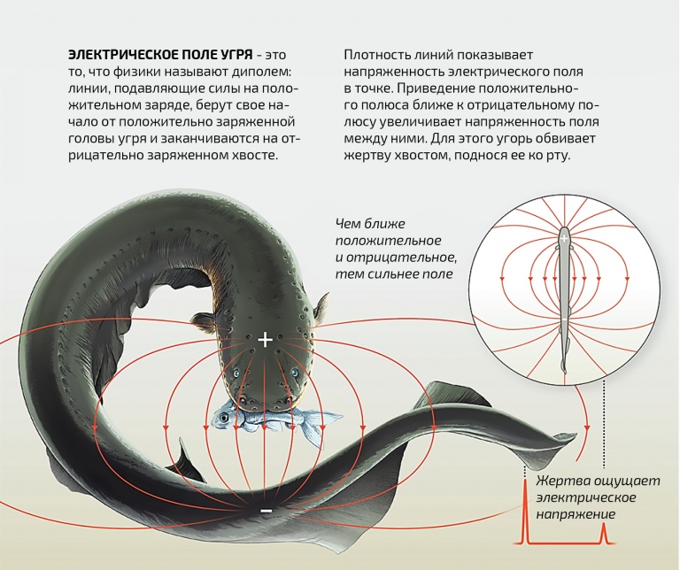 Когда угорь выдвигается на поиски добычи, он использует другие разряды – короткие последовательности из двух-трех импульсов. Они провоцируют у потенциальной жертвы мышечный спазм, и благодаря этому угорь понимает, где она спряталась. По колебаниям воды он ее настигает и тут же посылает другой, на этот раз убийственный разряд.