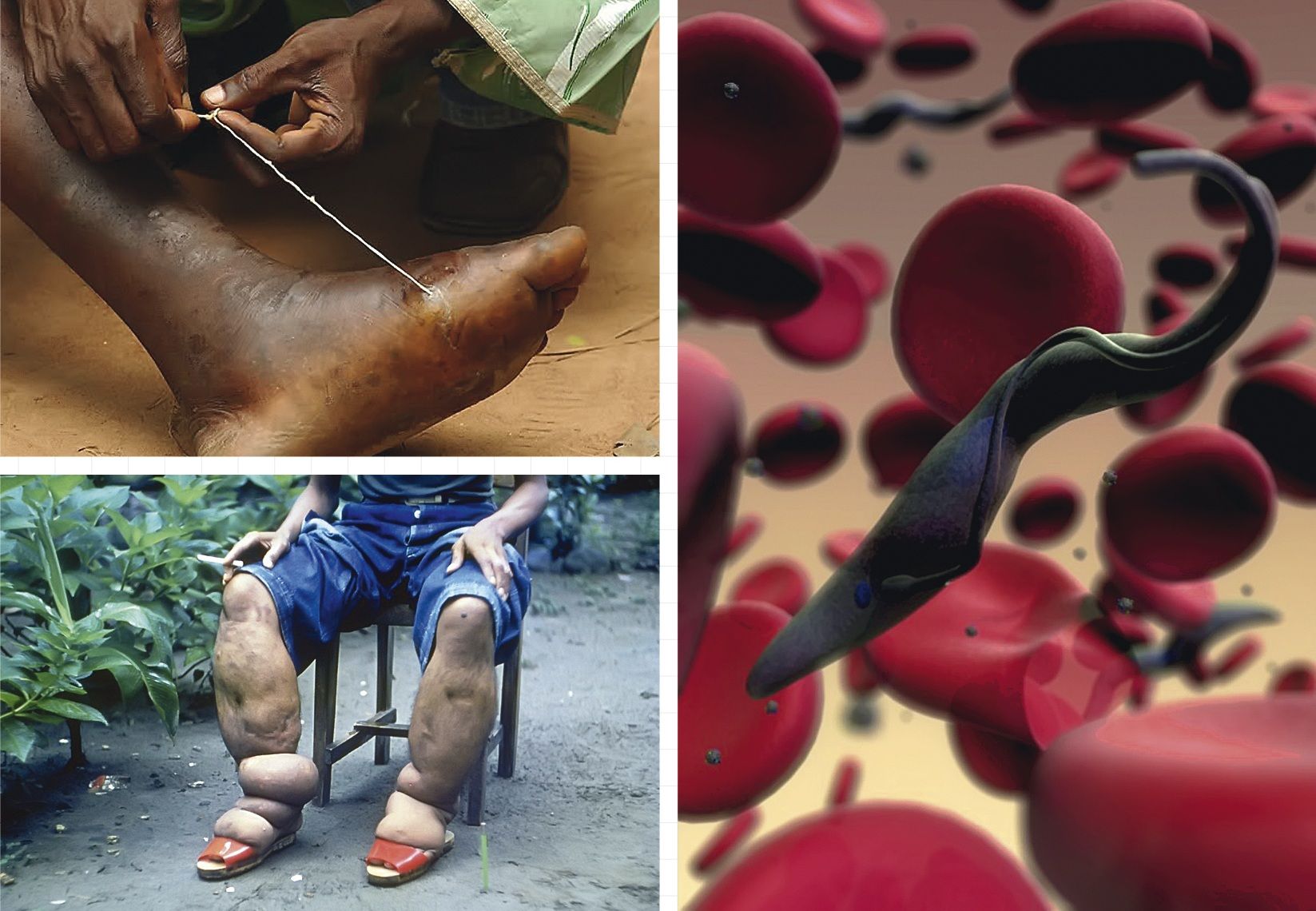 Слева: Ришта и нитчатка Банкрофта. Справа: Трипаносома в крови