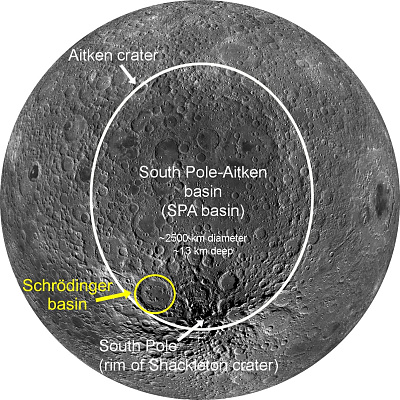 отмечен бассейн Южный полюс-Эйткен — самый большой и глубокий ударный кратер Луны. Бассейн Шрёдингера расположен внутри этого кратера, а значит у учёных есть уникальная возможность заглянуть в прошлое спутника на примере этого масштабного участка.