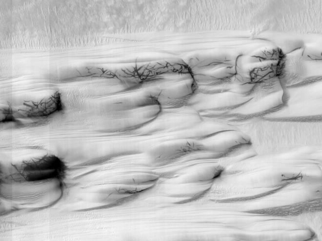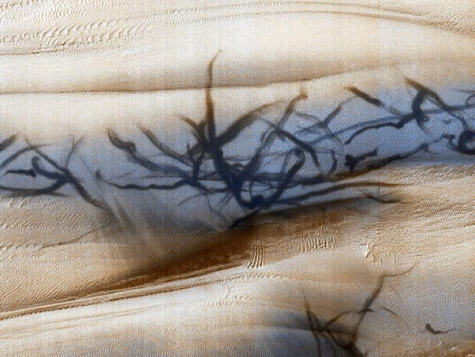 Снимки этих необычных деформаций на поверхности планеты MRO сделал в ударном кратере Галле, также известном как «улыбающийся кратер». Помимо своей необычной структуры, напоминающей классический смайлик, он также известен как место повышенной активности пыльных дьяволов.