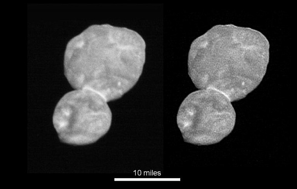 По серии снимков и улучшению четкости можно заметить постепенное приближение космического аппарата к этому странному снеговикоподобному объекту.