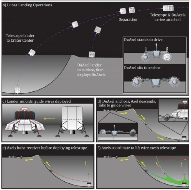 Радиотелескоп лунного кратера или LCRT будет размещён внутри крупного кратера на поверхности Луны – его диаметр составит от трёх до пяти километров. Для этого на спутник запустят особых роботов DuAxel. Они построят из проволочной сетки полусферический рефлектор километрового диаметра, а над его центром разместится приёмник, отвечающий за связь с Землёй.