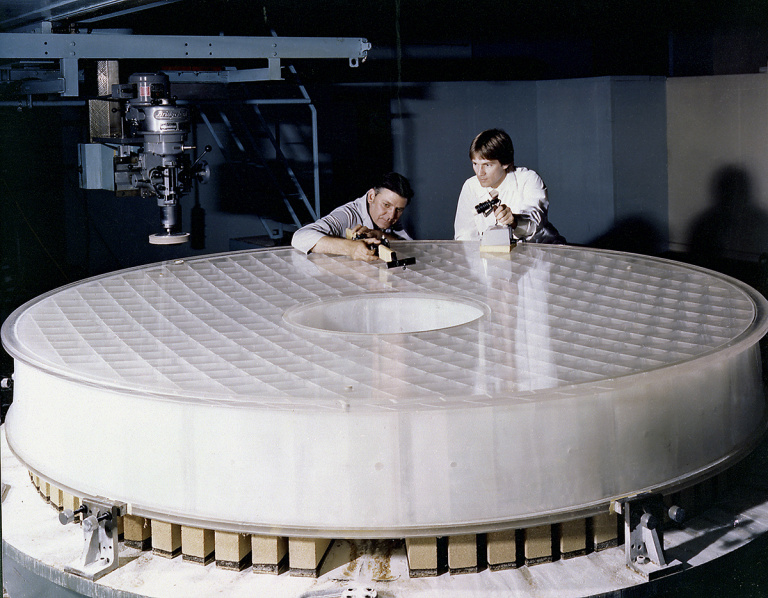 Итак, проект разделили: Центр космических полетов имени Маршалла контролировал строительство телескопа, а Центр космических полетов имени Годдарда занимался научной составляющей. Главным подрядчиком по сборке обсерватории, обеспечению ее функционирования стал «Локхид» (еще пока без «Мартина»), а создание главного инструмента обсерватории – ее оптического узла – доверили «Перкин-Элмер». Тогда эта компания обладала передовыми технологиями обработки зеркал и линз, она была одним из первопроходцев в автоматизации этого процесса. По сути, это был опыт, который раньше никто не практиковал.