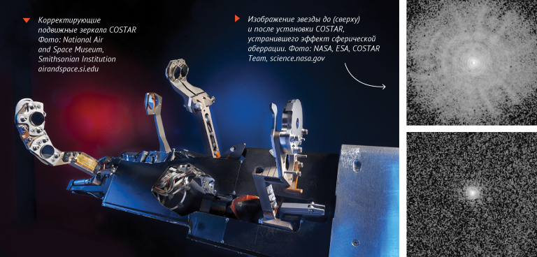 Первые наблюдения показали, что с обсерваторией что-то не так. Изображения получались более качественными, чем у наземных телескопов, но очень далекими от того, на что рассчитывали инженеры и ученые. Быстро выяснилось, что дело – в дефекте зеркала. К краю оно было отполировано сильнее, чем следовало. Ошибка составила всего лишь 2 микрометра, но этого оказалось достаточно для создания сферической аберрации, при которой свет от краев зеркала фокусируется не в той же точке, что из центральной его части.