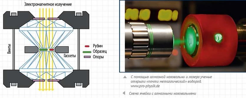 Первыми установками получения металлического водорода стали алмазные наковальни. Конечно, никаких кувалд в них нет, наоборот, их устройство заставляет вспомнить искусство Левши, примененное к объектам в тысячи раз меньшим, чем блошиная подковка. Типичный объем материалов составляет 1 кубический микрон (напомним, что микрон – тысячная часть миллиметра). Установка представляет собой два ограненных искусственных алмаза, соприкасающихся остриями. Если с помощью пресса сжать алмазы, то в месте их контакта будет развиваться значительное давление, часто превышающее 250 тыс. атм, предсказанные Ю. Вигнером. Сегодня в алмазных наковальнях исследователи уверенно работают с давлениями до 2 млн атм, а рекорд вообще составил целых 3,75 млн атм!
