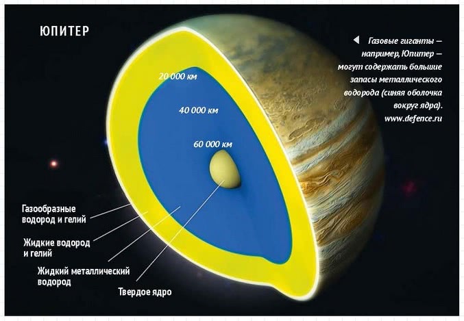 Масла в огонь подлили астрофизики, высказавшие идею: планеты-гиганты, Юпитер и Сатурн, представляют собой природные фабрики гипотетического металла. Во-первых, они более чем на 90 % состоят из водорода. Во-вторых, на них, мягко говоря, холодно: юпитерианское лето – это минус 100 °C. И, наконец, гиганты обладают довольно мощным магнитным полем. Одни только эти факты наводят на мысль о металлическом сверхпроводниковом ядре Юпитера!