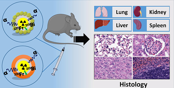 В рамках испытаний разработки на эффективность, исследователи ввели образцы наночастиц с радионуклидом в виде суспензии в хвостовую вену лабораторных мышей. На первый, пятый и десятый день после ввода суспензии грызунов безболезненно умерщвляли, чтобы рассмотреть их органы на предмет радиоактивности. Было установлено, что наночастицы 225Ас с золотым или титансодержащим покрытием почти не вредят здоровым тканям в отличие «чистого» ввода вещества.