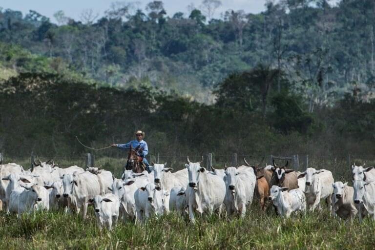 Крупный рогатый скот производит огромное количество согревающего планету метана, а огромные полосы поглощающих углерод лесов, в основном в Бразилии, вырубаются каждый год, чтобы освободить место для их пастбищ.