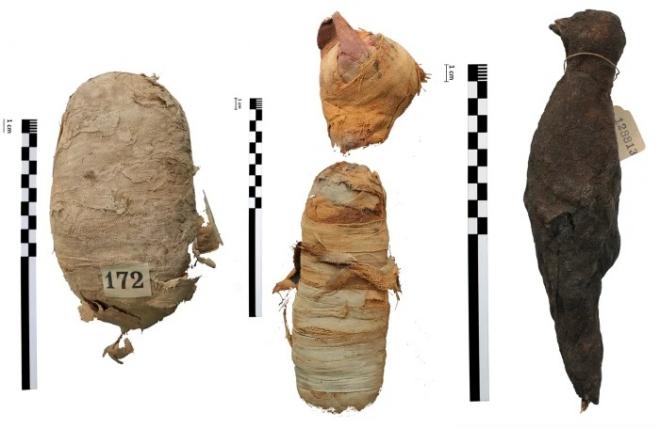 Этими тремя животными были кошка, птица и змея. Как показало сканирование, кошка, скорее всего, была домашним котенком, который умер в возрасте до пяти месяцев, о чем свидетельствуют еще не прорезавшиеся зубы. У животного была сломана шея, но неясно, был ли перелом причиной смерти или повреждение произошло после, когда котенка мумифицировали.