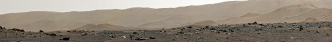 Вдали от Perseverance на панораме виднеется край кратера Езеро, внутри которого и произошла высадка марсохода. Увидеть его во всех деталях возможно с использованием увеличения на оригинальном изображении.