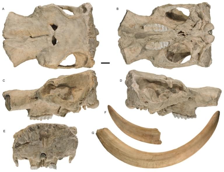 Mammut pacificus, голотип черепов и клыков. Череп в: (A) спинном, (B) вентральном, (C) левом боковом, (D) правом боковом, (E) заднем, (F) дистальном конце левого клыка (I1), боковом и (G) правом бивне (I1), вид сбоку. Все изображения являются ортогональными видами фотограмметрических моделей. Масштаб = 10 см. Предоставлено: PeerJ (2019).Калифорнийские окаменелости были найдены в 1990-х годах, где было обнаружено 100 000 скелетных окаменелостей – сейчас область покрыта аварийным резервуаром для воды, поэтому вряд ли будет найдено что-то еще. Исследователи