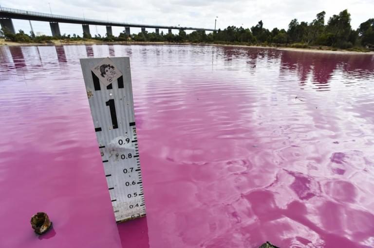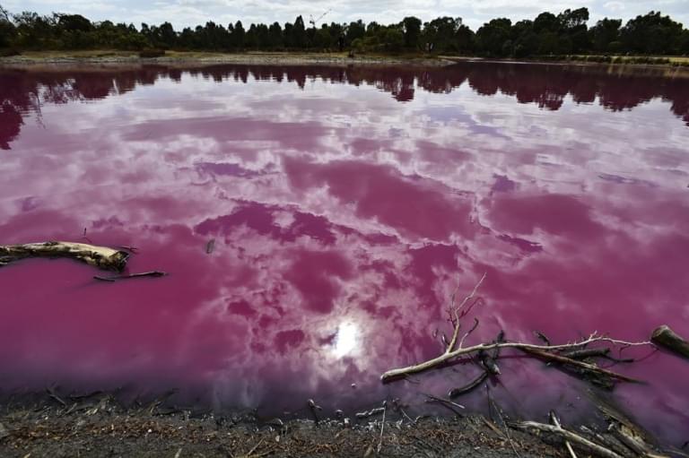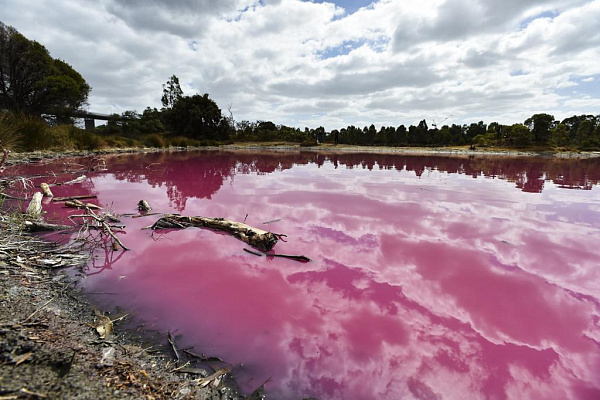 Австралийское соленое озеро Вестгейт в парке Мельбурна окрасилось в ярко-розовый цвет — причины вполне естесственные: много солнечного света, редкие осадками и тепло заставили водоросли на дне озера производить красный пигмент бета-каротин.