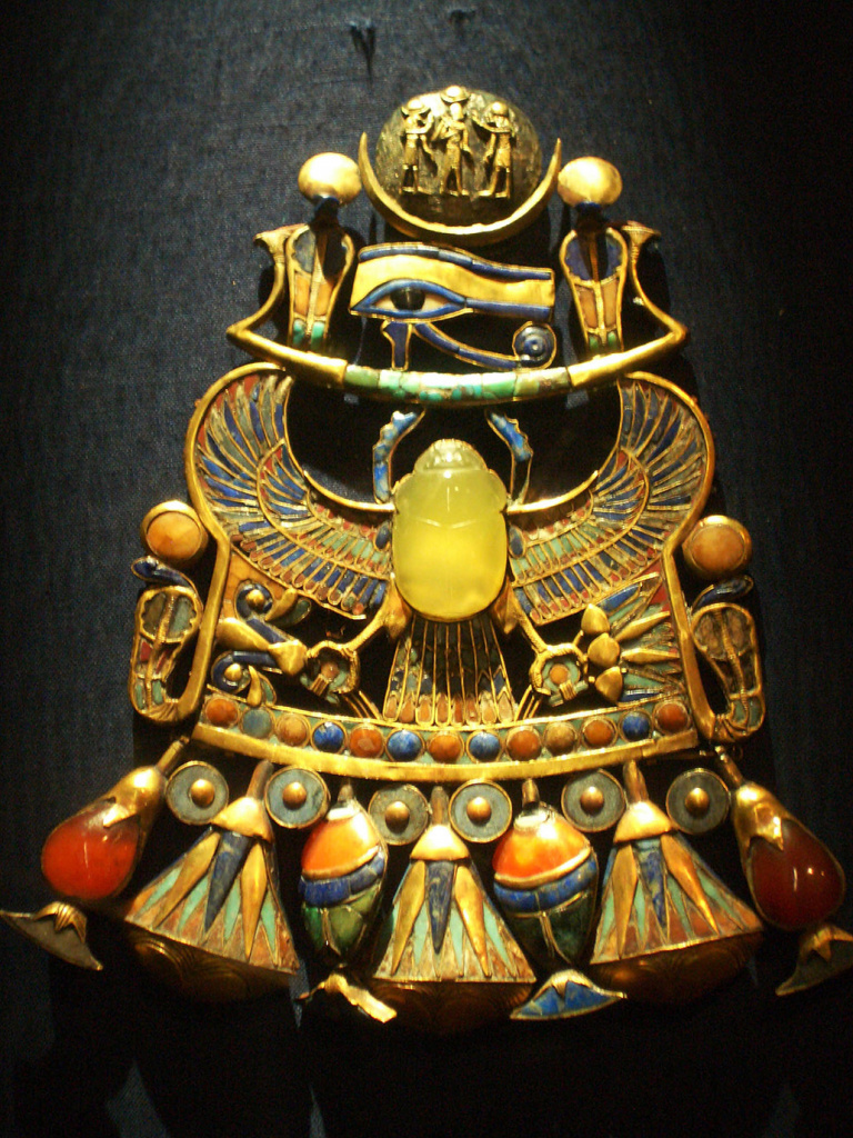 Украшение Тутанхамона. Желтый камень в центре — ливийское стекло. Фото: Prima Zoom, csfd.cz