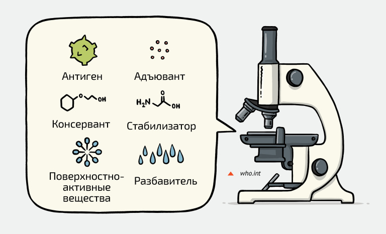 - Консерванты (нужны, если флакон с вакциной не одноразовый и используется более чем для одного человека).