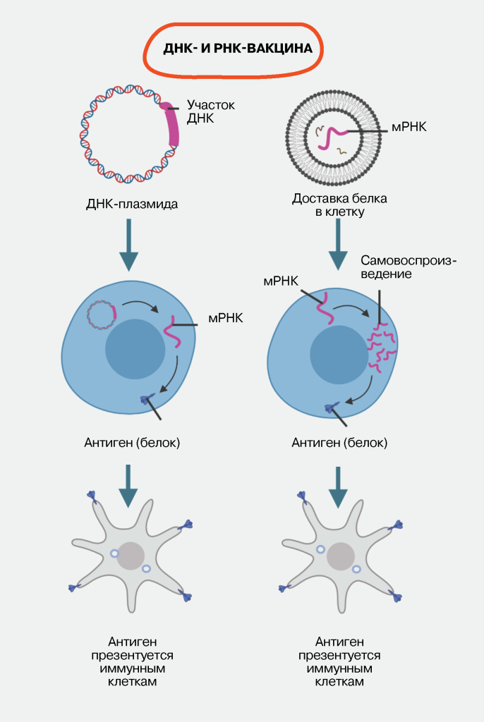 Вакцины на основе нуклеиновых кислот, или ДНК- и РНК-вакцины – тоже относительно новое изобретение. Они доставляют в клетки вакцинируемого не антиген в каком-либо виде, а информацию о нем: нуклеиновую кислоту, которая кодирует характерный для патогена белок. Клетки начинают сами производить этот белок, и логично, что иммунная система воспринимает его как антиген – и уничтожает. Это примерно как посеять в гарнизоне крепости зерно каких-то чуждых идей, а затем эффектно избавиться от тех, кто ими проникся. Звучит странно, но в жизни действенно: например, вакцины Pfizer-BioNTech и Moderna от Covid-19 – именно РНК-вакцины. А за разработку методов защиты матричной РНК от иммунной системы человека (чтобы она не стерла информацию раньше времени) уже выдали Нобелевскую премию – ее получили Каталин Карико и Дрю Вайсман в 2023 году.