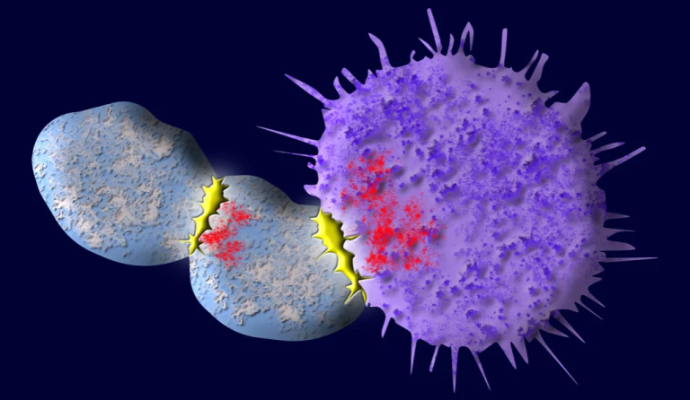 CAR-T-терапия: Т-лимфоциты (голубые) по антигенам (красные) находят раковые клетки (фиолетовые) и убивают их. Но бывает, что антигены прикрепляются к другим Т-клеткам, которых из-за этого атакуют «свои». Иллюстрация: Xiaoyu (Ariel) Zhou, news.yale.edu
