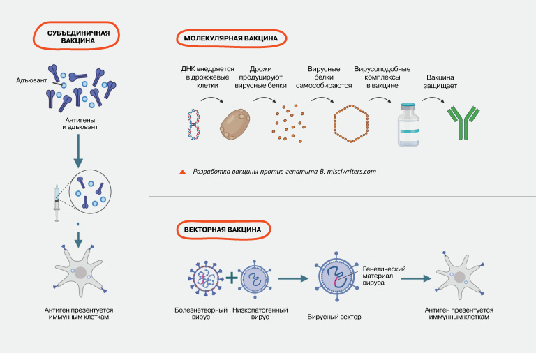 Молекулярные (рекомбинантные) вакцины синтезируются с помощью генной инженерии. От возбудителей в них только генетический материал. Его внедряют в дрожжевые клетки, и те продуцируют антиген – остается его выделить и очистить. В примере с крепостью такие вакцины можно сравнить с роботами-андроидами: выглядят почти как настоящие, но сделаны в лаборатории. Их используют против гемофильной инфекции, гриппа, вируса папилломы человека, гепатита B, коклюша, пневмококковой и менингококковой инфекций.